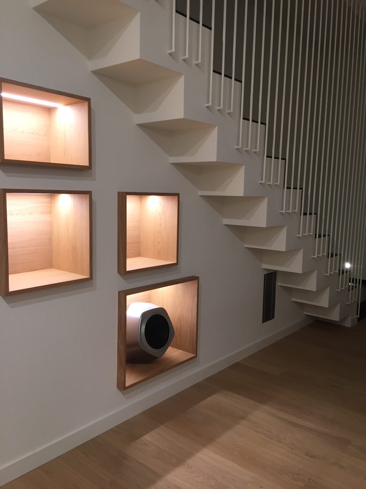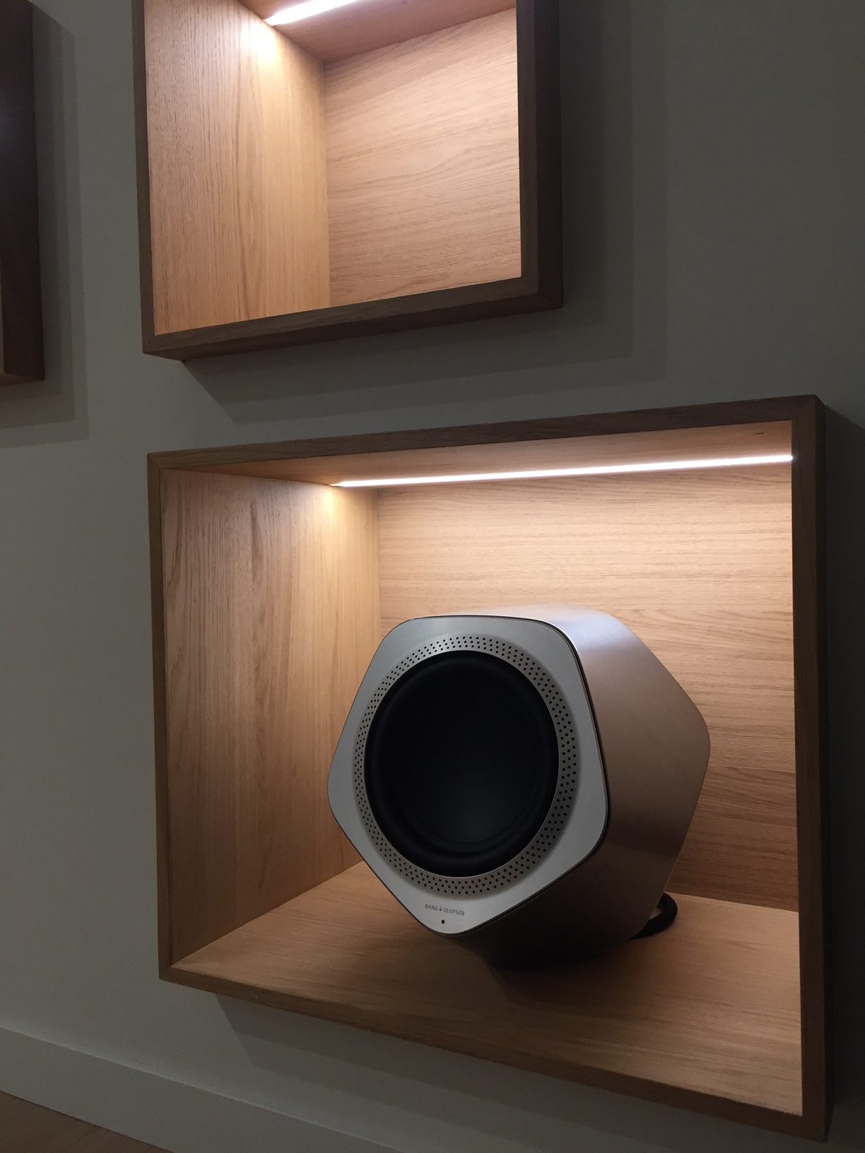 Living con Beovision Avant e diffusori frontali a parete. Subwoofer integrato in parete e sistema multiroom nelle varie stanze collegate