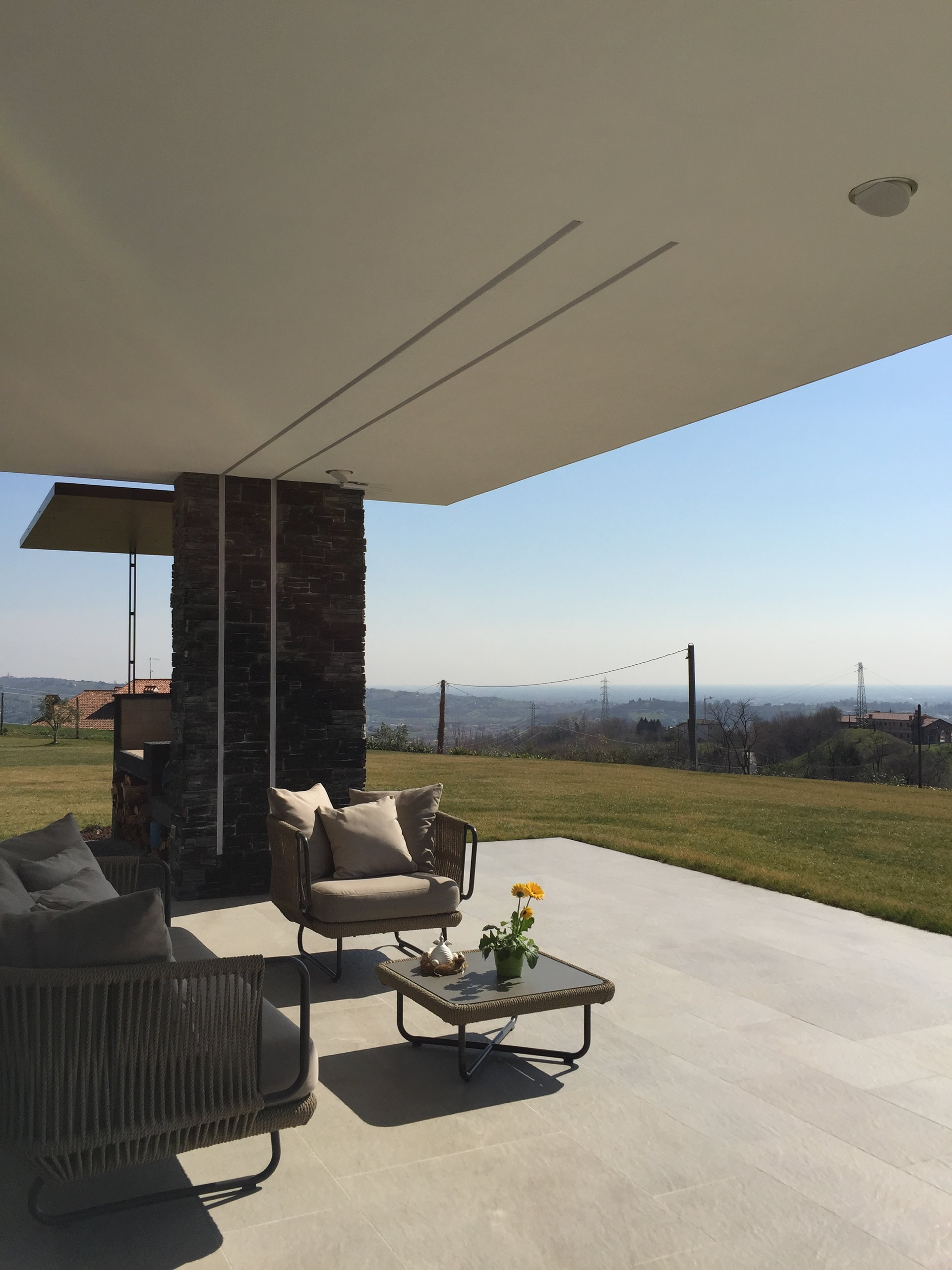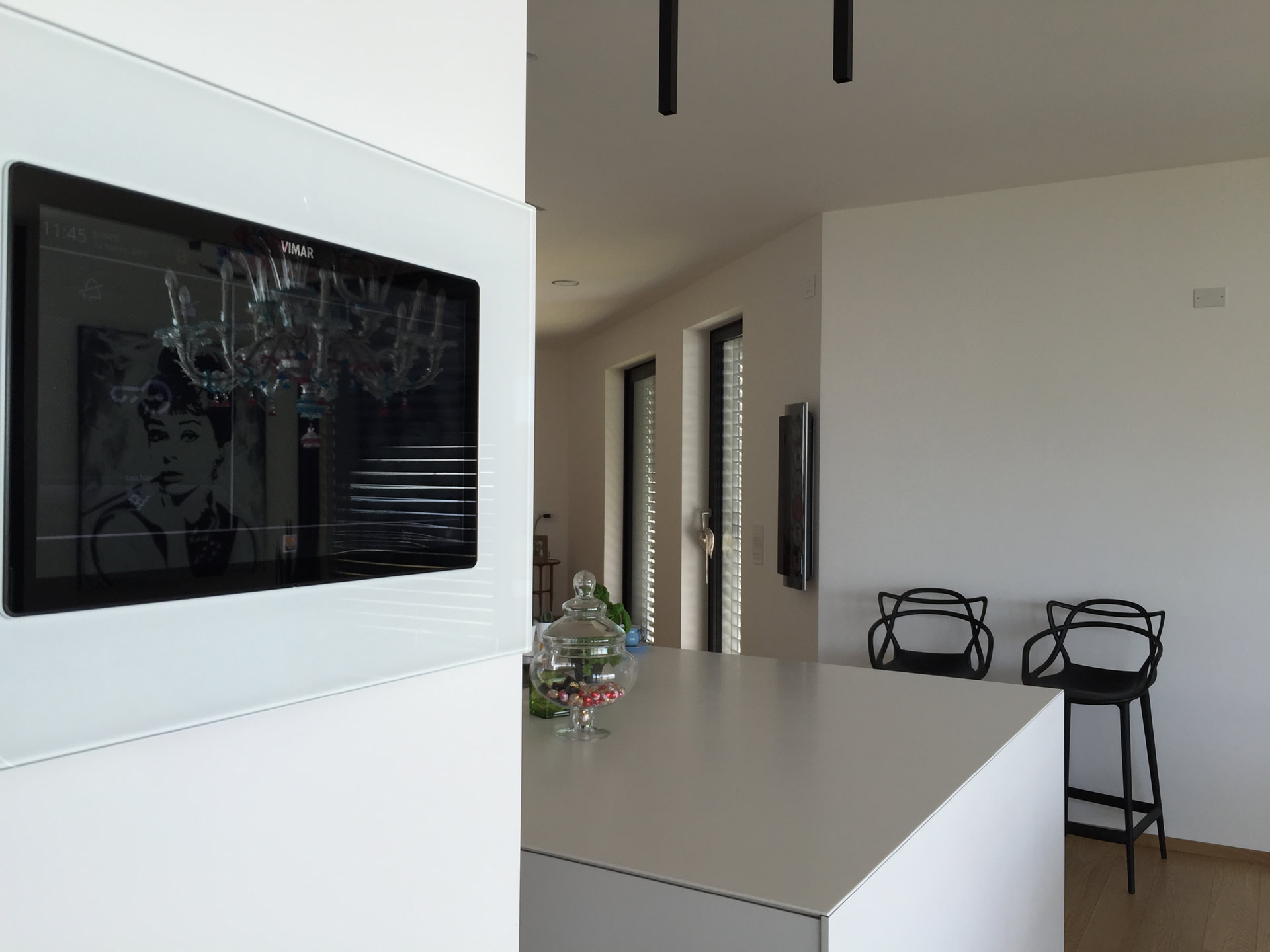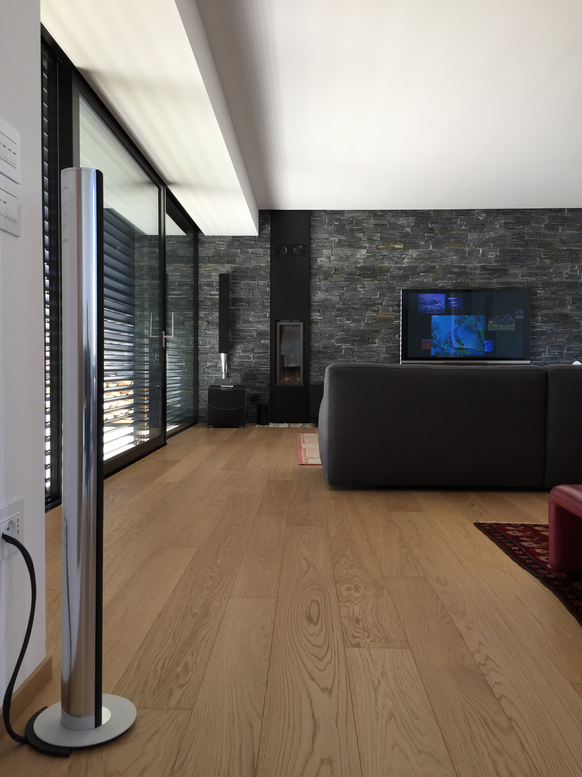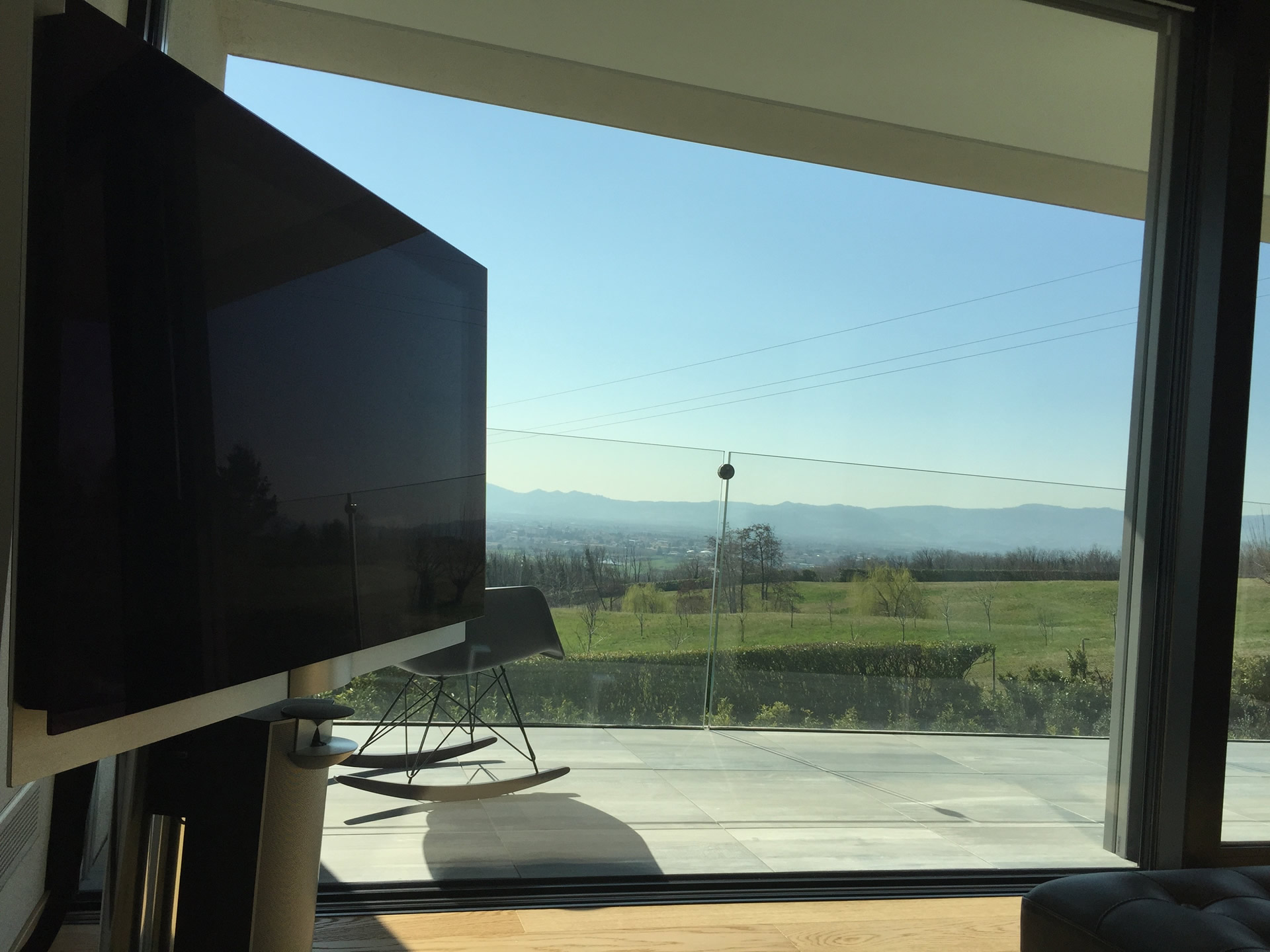 Abitazione nelle colline vicentine immersa nella natura con finiture di primissimo livello. Nel soggiorno spicca un Beovision 12 65 pollici Bang & Olufsen con sistema surround. Nella zona pranzo un Beosound 9000 caricatore a 6 dischi รจ appeso in verticale per essere comodamente azionato anche manualmente. L’impianto prevede anche un Tv nella zona notte e diversi diffusori ad incasso dentro e fuori la villa.