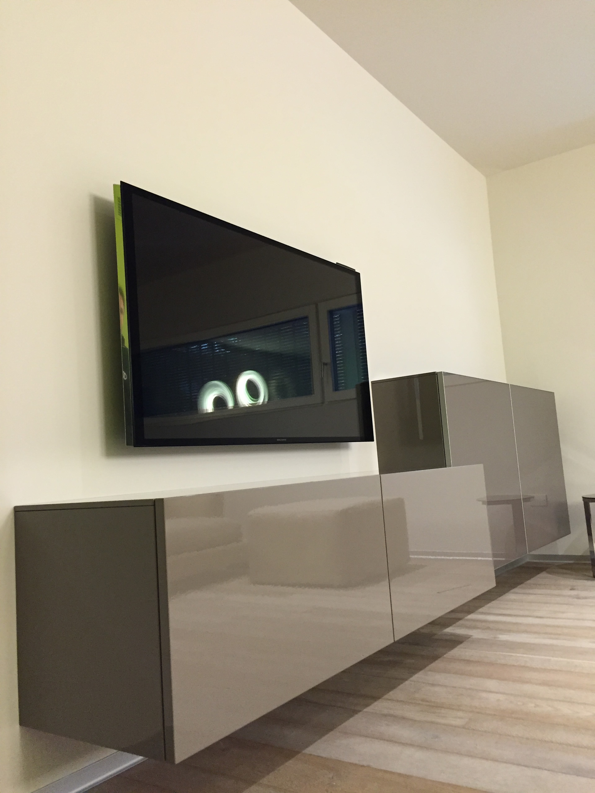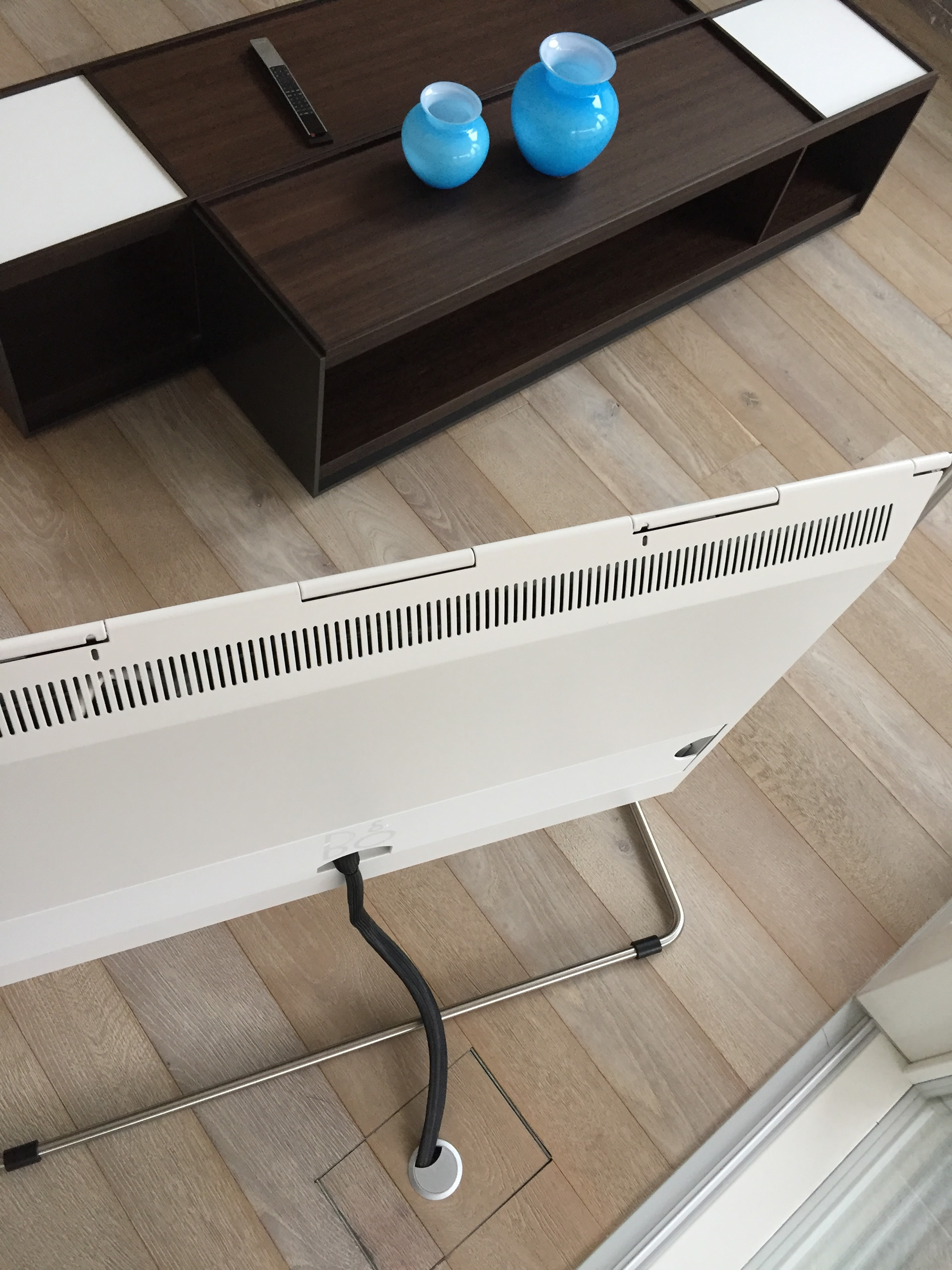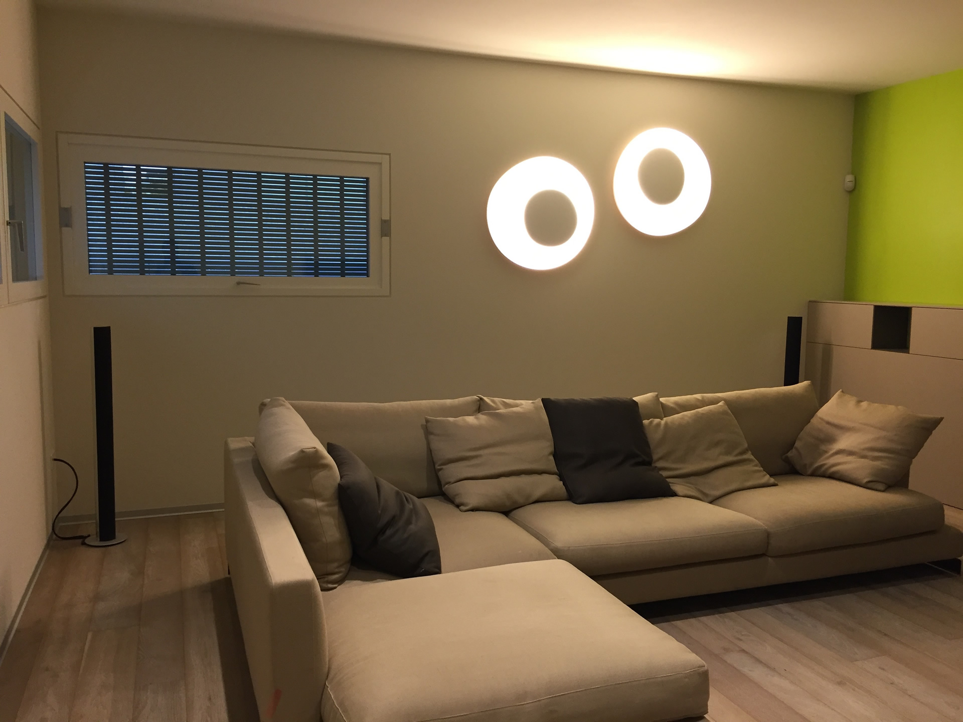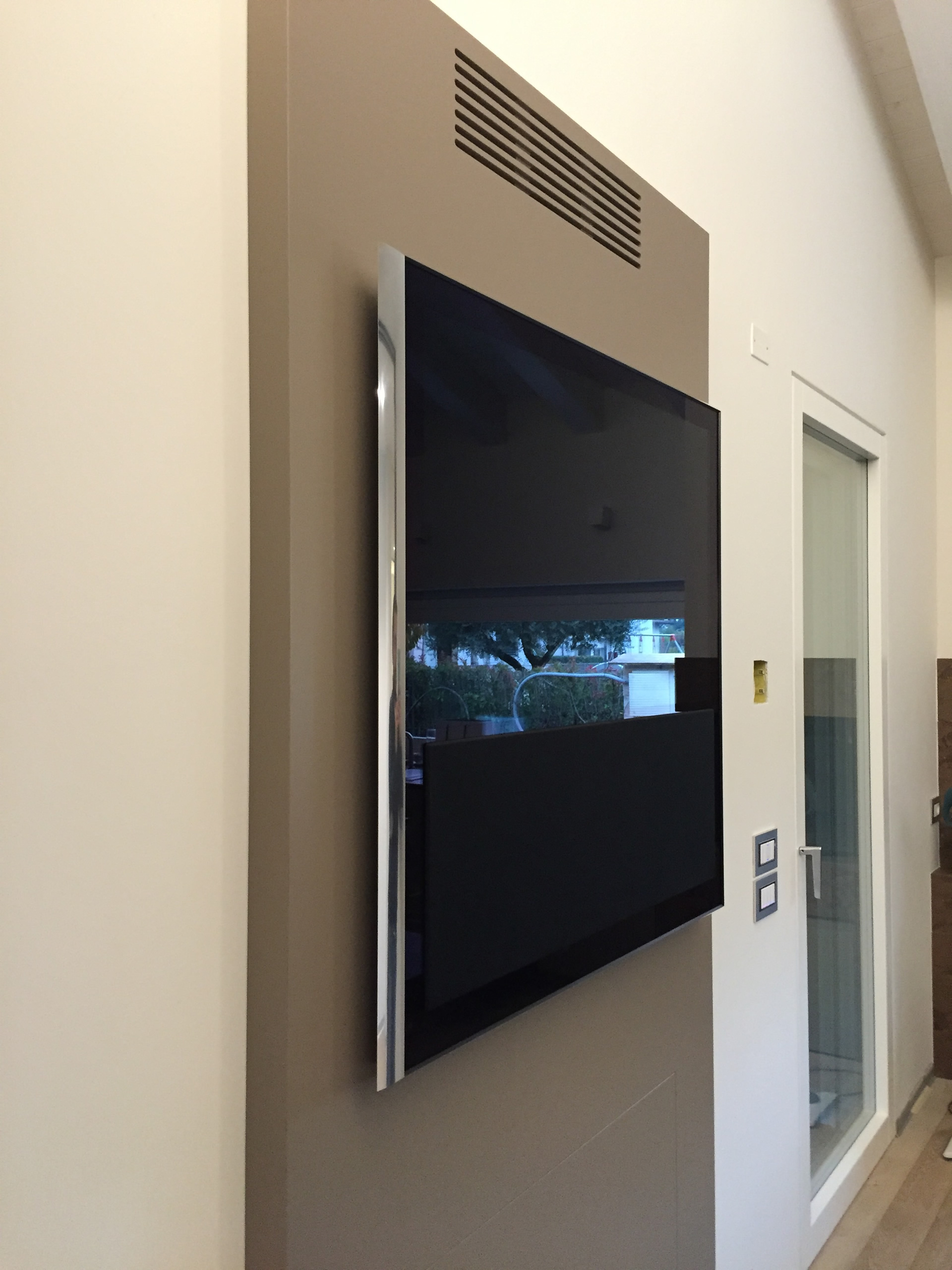 Impianto multiroom audio con diffusori e televisori Bang & Olufsen. Sala Tv con BeoVision Avant 55 pollici, soggiorno con BeoVision 10 e veranda con BeoPlay V1 e relativo supporto a pavimento.