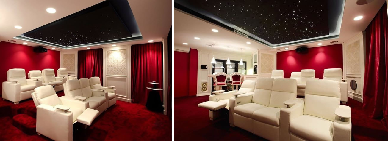 Schermo 110 pollici con sistema audio a 7.2 canali con diffusori ad incasso motorizzati supervisionato da sistema domotico Crestron.